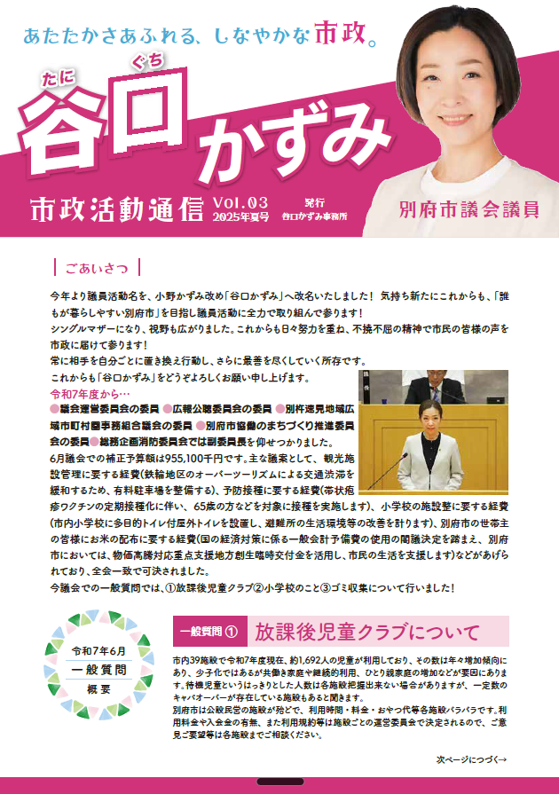 谷口かずみ 市政活動通信Vol.03 2026年3月1日 最終更新日時 : 2026年3月10日 ex 市政活動通信Vol.03 -2025 夏号 内容 ごあいさつ 令和7年6月 一般質問の概要 活動報告(地域活動への参加など) 市政活動通信Vol.03-2025 夏号 ダウンロードはこちら \ 最新情報をチェック /
